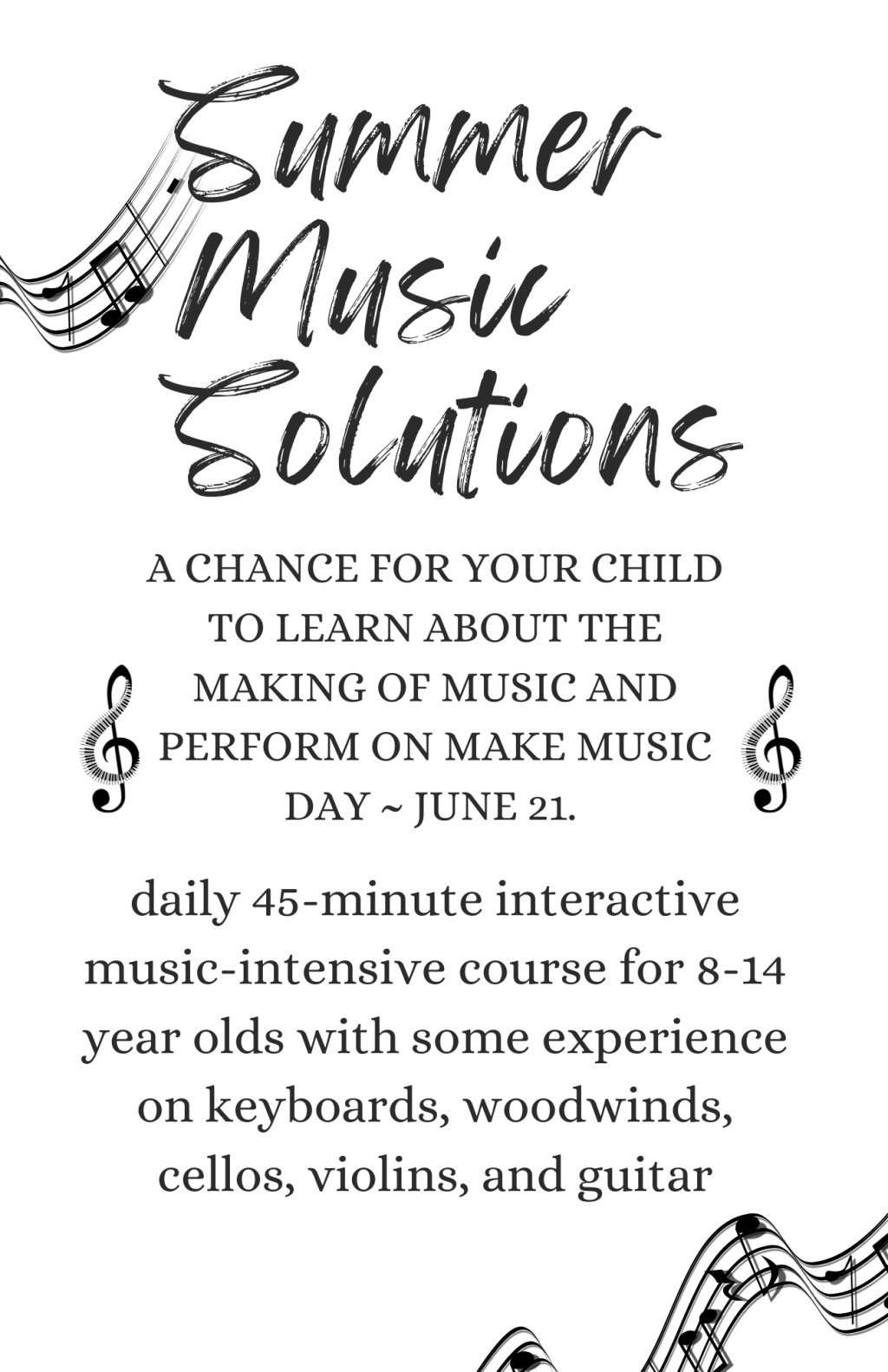 Help your 8-14 year old student use Summer Music Solutions Composition Manual to create music inspired by many types of animals and sharpen their ability to make music with others! It will include detailed instructions on how to decide what type of notation you want, how to create a variety of musical textures, a memorable melody and a form that reflects the animal story you want to tell. The manual will be available to purchase by May 1st and is free with the upcoming camp inspired by International Make Music Day.